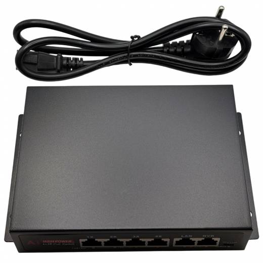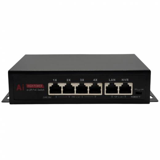HN-POE204 V2 – неуправляемый коммутатор на 6 портов, 4 из которых с поддержкой технологии POE стандарта 802.3af/at (Type A) 100Мбит. Максимально поддерживаемая мощность подключаемых устройств составляет 30Вт на порт. Дополнительно присутствуют 2 порта с максимальной скоростью до 100Мбит: один для подключения видеорегистратора или другого видеозаписывающего устройства, другой для подключения к сети интернет-провайдера. Данный комутатор может работать в режиме IPC, который позволяет передавать данные без питания по PoE на расстояние до 250 метров на скорости до 10 Мбит/с. Максимальная суммарная нагрузка на POE составляет 75 Вт